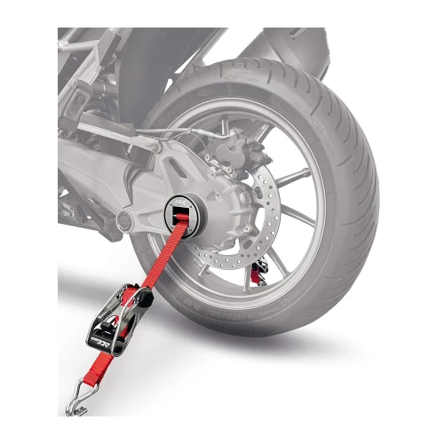 ACEBIKES CapStrap festesystem er designet for BMW-motorsykler med 5,3 cm hulaksler. Også kjent som åpen bakaksel. CapStrap systemet sørger for at motorsykkelen din forblir stående i rett vinkel og sikkert på plass, uansett hvor du tar den med.