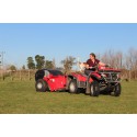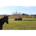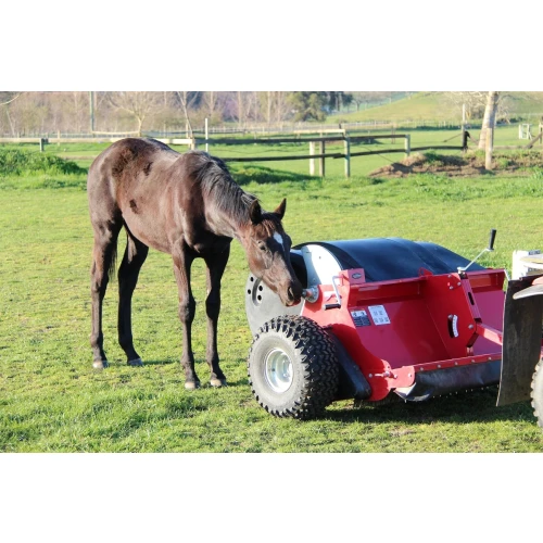 Børstene roterer når maskinen trekkes. Fin oppsamlingsbredde på 1200 mm og oppsamlingskammer på 500 liter som enkelt kan tømmes ut på egnet plass. Kammeret tilsvarer ca. 3-4 trillebårlass med møkk før du trenger å tømme. Denne lille maskinen er egnet for oppsamling etter inntil 15/20 hester eller alpakkaer. Hekt oppsamleren på ATV, quad eller minitraktor med hengerfeste og du er klar til å rydde beitet på den enkle måten. De store dekkene gir oppsamleren trekkraft til å rotere børstene, og vil være effektiv på beitehøyde inntil ca 125 mm. Dersom du ikke liker å fylle på drivstoff eller håndtere motorer er dette maskinen for deg. Dette er vår mest grønne maskintype, som også er de enkleste. Selv uten motor er Tow And Collect 1220 fem ganger raskere enn en vanlig, vakuummaskin. Dette skyldes det konstante oppsamlingssystemet som ikke krever at du starter og stopper ved hver gjødselbunke, bare kjør over den og møkka forsvinner - det er så enkelt.