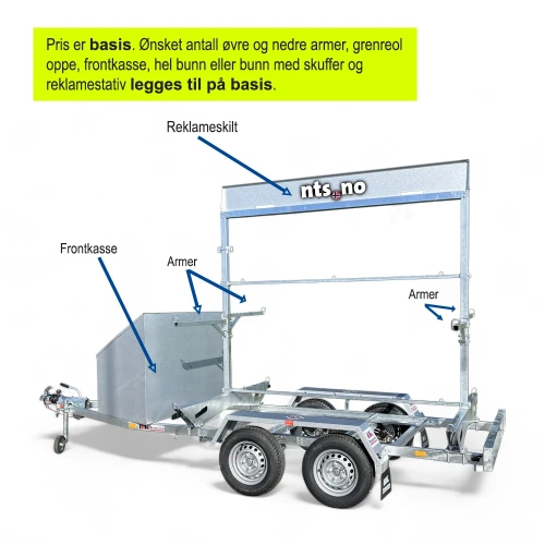 Opplyst pris er baisisramme uten grenreoler, armer, kasse fremme og reklamestativ. Dette av den enkle grunn at hver henger tilpasses etter ønske fra kunde fordi ulike stillas gir ulike behov. Se "tilbehør" for komplett liste på deler som kan monteres.