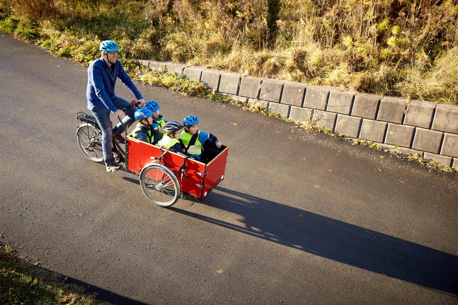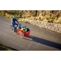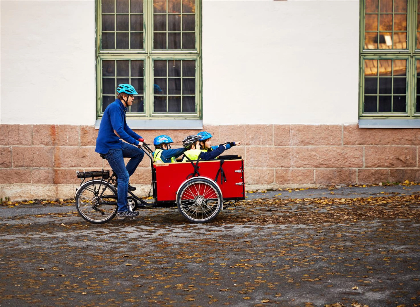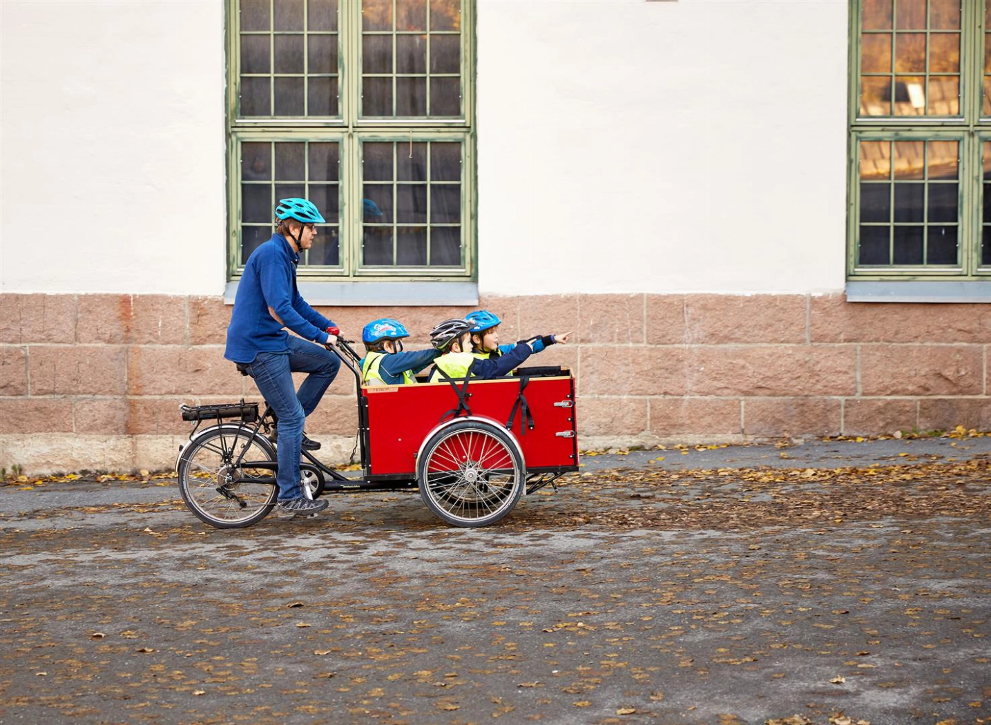 Denne sykkelen har vi solgt til mange barnehager, og vi har vunnet de fleste offentlige anbudskonkurranser med den. Grunnen til sykkelens suksess er at den er skånsom mot både barn og ansatte med støttefot som gjør den fullstendig stabil under på- og avstigning, og dør i front som gjør at barna kan gå om bord selv. Det er selvfølgelig trepunkts seler til alle passasjerer, og syklistens (sjåførens) posisjon gjør at det er fint og enkelt å kommunisere med barna underveis.