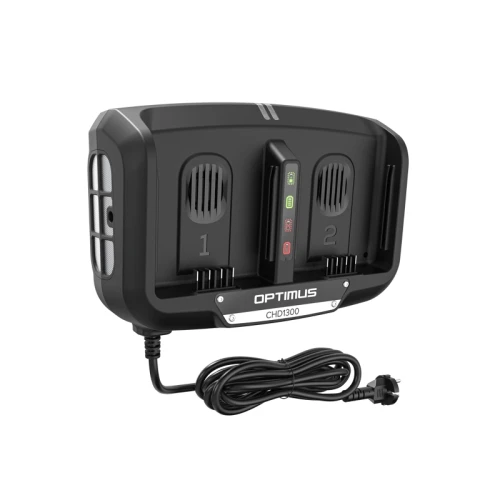 Den nye Optimus CHD1300 dobbeltlader er vår kraftigste lader for profesjonell bruk, med en ladestrøm på 16 A og en maksimal effekt på 1280 W. Denne teknologien gjør det mulig å lade et CORE200 batteri opp til 80 % på bare 14 minutter, slik at du har uavbrutt energi gjennom hele dagen.