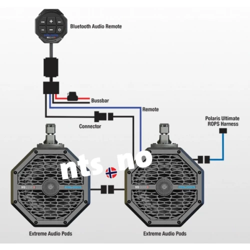 Krever kabelsett (kjøpes separat.) hovedenhet eller Polaris Bluetooth Remote (Vårt art. nr. 2881470). Fantastisk sammen med Polaris "Soundbar 8" (Vårt art. nr. 2881465) som også er utviklet av MBQuart for Polaris RZR, Ranger og Ace. Se video av RZR med dette oppsettet nedenfor. Se eksempel på oppsett sammen med "Soundbar 8" i bilderullen.