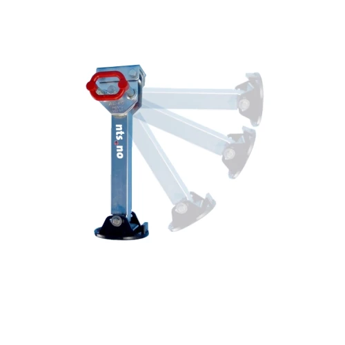 Drop down Tredal støtteben til skaphengere / Offroadhengfere / lokkhengere. Nedfellbart støtteben for hjørnemontering. Kan stilles inn i 6 forskjellige posisjoner; fra horisontalt til vertikalt til horisontalt. Enkel i bruk, trekk i håndtaket for å vinkle ned. Lastekapasitet på 500 kg og sort bakkeplate som også kan vinkles. Lengde finjusteres mot bakken med medfølgende sveiv. Har en flat monteringsbrakett med 2 x 10 mm hull.