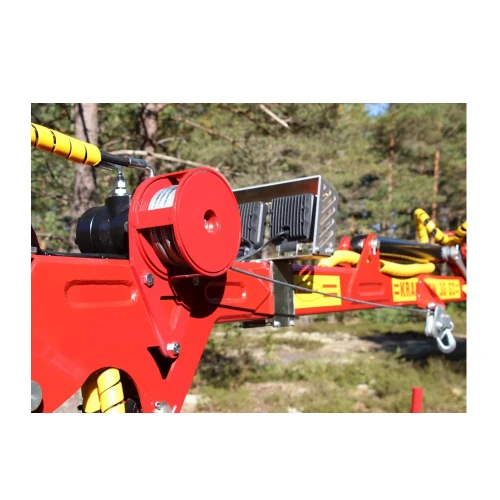 Fjärrstyrd hydraulvinsch HV500 är en välbeprövad och pålitlig konstruktion. Vinschen är 3 gånger så snabb jämfört med en el vinsch och har en dragkraft på 800 kg. Självklart är den radiostyrd. Det är ett perfekt hjälpmedel om du skall köra vindfällor som har hängt sig. Du kan även spara mycket tid. Även om det går att köra dit och lyft på det med kranen så kan det i många fall gå betydligt fortare att hoppa av fyrhjulingen och vinsch dom metrarna som fattas. Denna vinsch passar på våra griplastarvagnar och kan även eftermonteras.