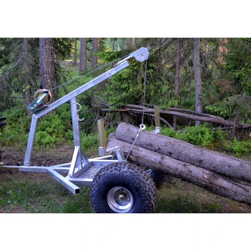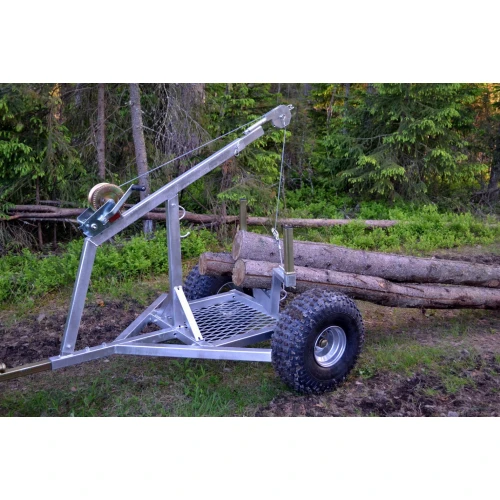 Solid bygget og galvanisert lunnings tilhenger m/vinsj til ATV og mindre maskiner. Perfekt for utkjøring av lange, men også korte trær/stokker fra skogen som tynning, ved & vindfall etc. Vinsjetårnet har teleskopfunksjon og vinsj medfølger. Vridbar lastebanke med surreøyer og pigger.