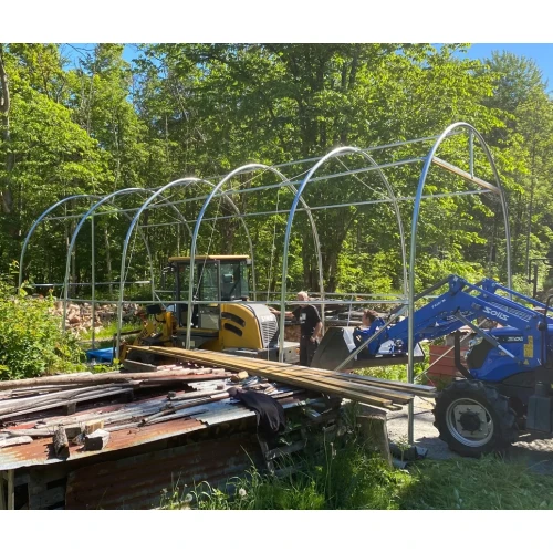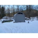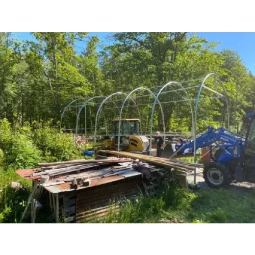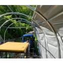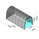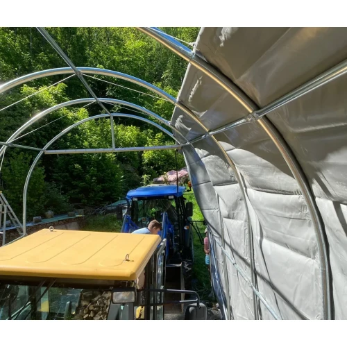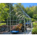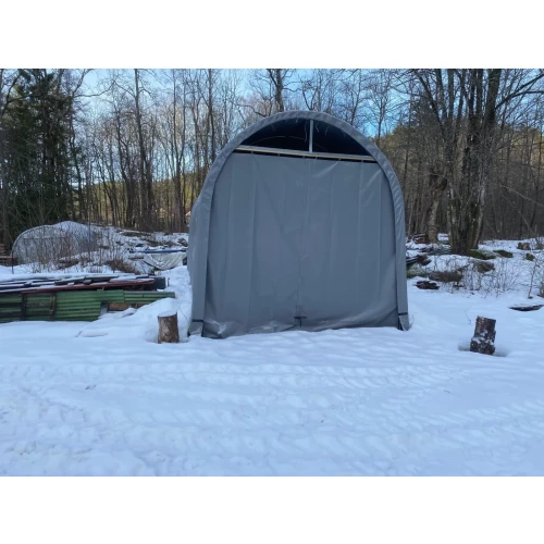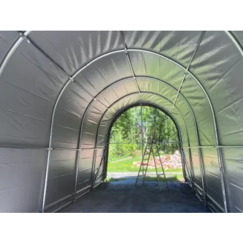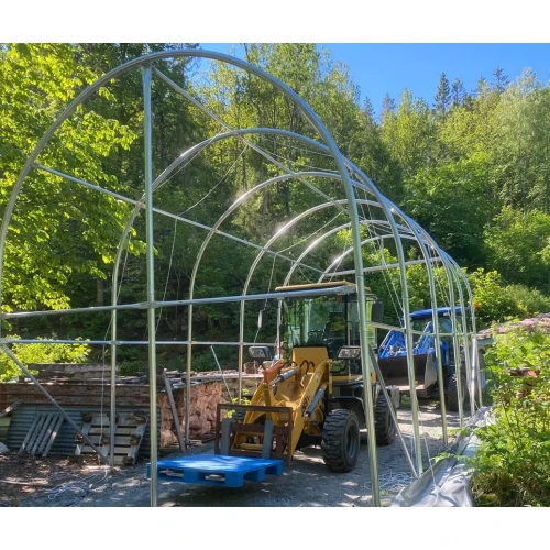 Solid hall med 2 ekstra bøyler i forhold til standard. Tåler nordisk klima godt. Avstanden mellom stålbuene er 1,31 meter. Tak og veggduk er laget i PVC. Duken er grå og veier 610 gr. pr. kvadratmeter duk. PVC duken er UV bestandig og må ikke sammenlignes med PE duker som har en begrenset holdbarhet, gjerne 3-5 år. Dørløsning er enkel å betjene.