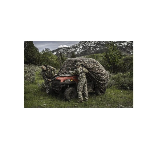 Polaris® Pursuit Camo SxS Field Cover. Now You See It. Now You Don’t. Stealth is the name of the game when in pursuit of your prey. Now you can ensure your RANGER® is out of sight while in the field with our new Camo Field Cover. With top to bottom coverage, your RANGER® will blend into the environment so as to not disrupt wild game patterns. What’s more, the lightweight and easy to transport cover is the ideal solution to keep rain, dirt and dust off your vehicle when at home. Not intended for open towing protection.