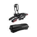 Pakke: Thule Santu bagasjeboks og Thule Easyfold 3 sykkelholder for to sykler. Praktisk, sammenleggbart Thule sykkelstativ for tilhengerfeste og mulighet for å sette på boksen ved behov. Plattform til 2 sykler. Svart. Thule EasyFold 3 er en fleksibel sykkelholder som passer til en rekke sykkeltyper, inkludert el-sykler.