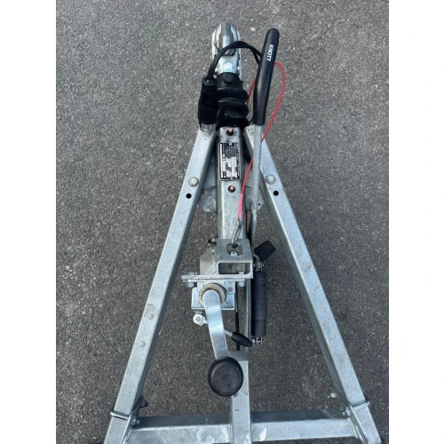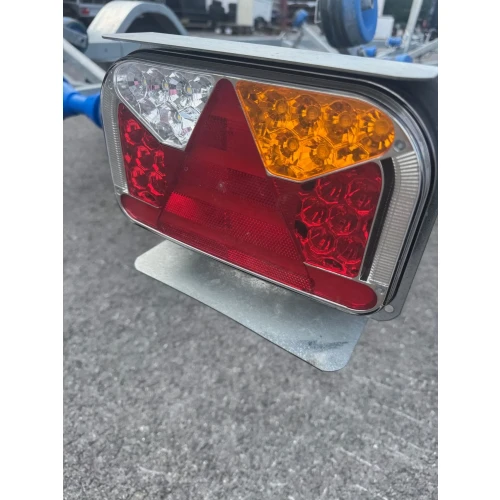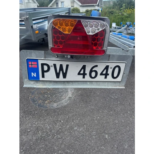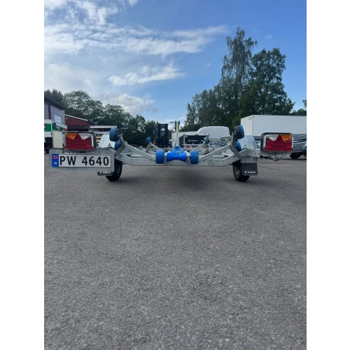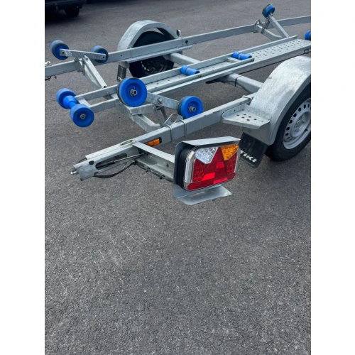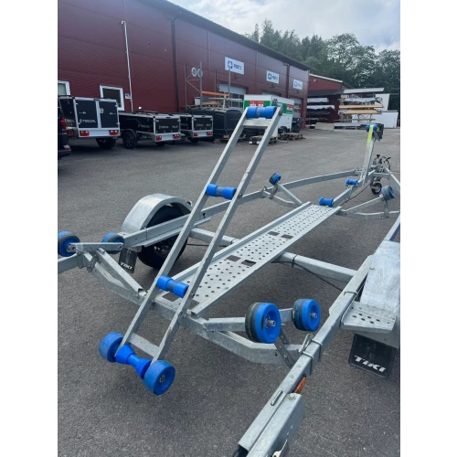Baklyktene er utvippbare med gassdemper som holder de på plass, så det er ingen behov for å ta de av, og fikle med ledninger. En anerkjent Goliath sikkerhetsvinsj med autostans funksjon, nylonbånd, lukket kammer og 3 gir er montert på høydejusterbart vinsjtårn med skånsom bauggummi foran. Det er bare å vinsje båten på plass og vippe lyktene tilbake i stilling. Hengeren er naturligvis utstyrt med brems slik at en lovlig kan holde 80 km/t. selv med aktuell vekt over 300 kg. Anbefalt opp til ca. 20 fot. Nyttelast på 706 kg.
