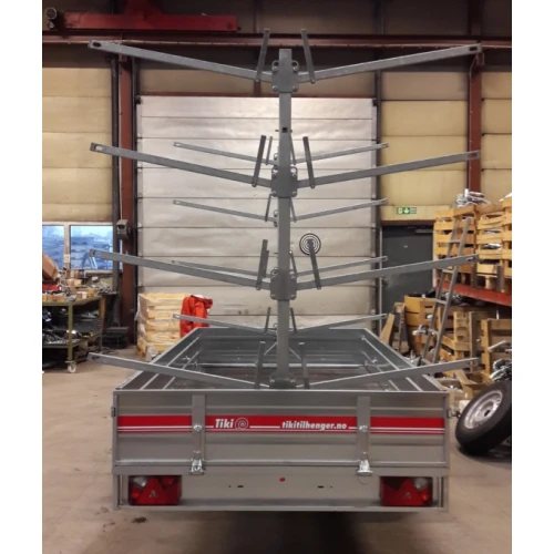 Vi har en del forespørsler på totalhøyde, altså på tilhenger + stativ. Innlastingshøyden på tilhengeren er ca. 54 cm. og kajakkstativet ca 200 cm. høyt. Med forbehold er totalhøyden således +/- 255 cm.