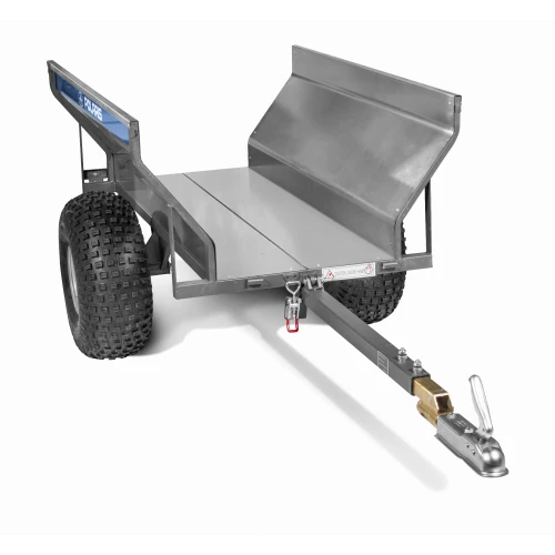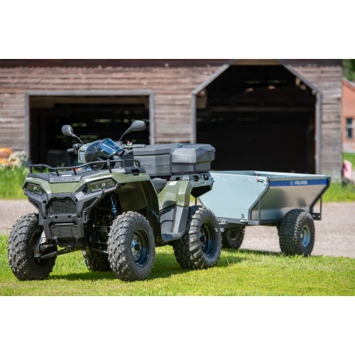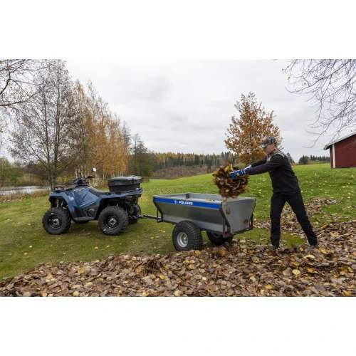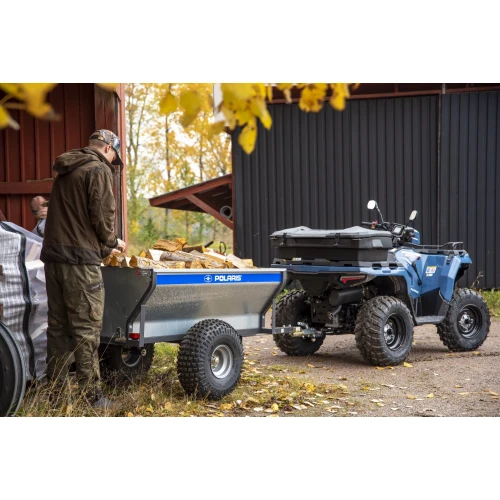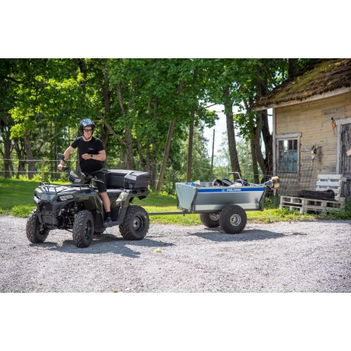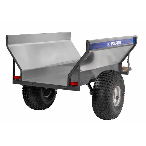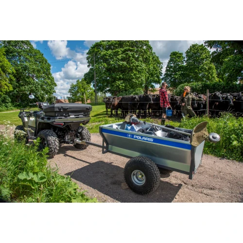 Enkel, praktisk, stabil og prisgunstig ATV henger fra Polaris med roterende kobling og tippfunksjon, ventilbeskytter, 22" dekk og avtagbar for- og baklem.