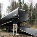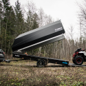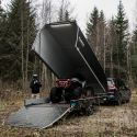 Plastdekslene på skjermene inni tilhengeren beskytter skiene på snøscooteren under lasting og lossing. Lasteplanet er utstyrt med stroppfester både i karmene og midt i hengerbunnen for optimal sikring av lasten. Planet tippes enkelt med skrutipp og baklemmen er utformet for påkjøring av snøscooter. Helsveiset ramme gjør hengeren ekstra solid.