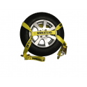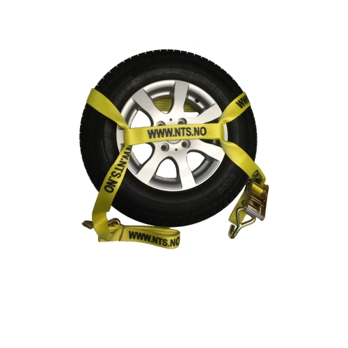 Bruksanvisning: Fest kroken på den lange delen av stroppen til et egnet festepunkt på tilhengeren, før så den endeløse enden av surringen igjennom den ene siden på den korte stroppen. Tre deretter båndet bak hjulet for så og tres igjennom den andre siden av den korte stroppen. Deretter tar man kroken på kortdelen og fester til et egnet festepunkt på tilhengeren. Før den endeløse delen av stroppen inn i strammeren og forstram stroppen. Påse at båndet bare går rundt dekket og ikke er borti andre vitale deler på kjøretøyet før man strammer fast dekket helt tilslutt. Følg denne prosedyren på alle fire hjulene, men jobb diagonalt. Start med forhjulet på høyre side, så bakhjulet på venstre side etc.