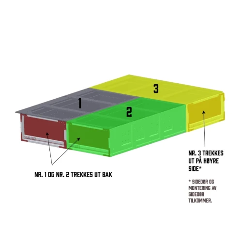 Det er plass til inntil 3 stk. i våre mest populære lokkhengere: Tredal UCH modellene og Offroad modellene. Mulige posisjoner fremgår av bildet. Velger du posisjon 1 og 2, eller 1, 2 og 3 vil det lønne seg med gulvplate oppå skuffene (varenr. 3382 mot pristillegg). Velger du posisjon 3; skuffe-seksjon foran på tvers må du også investere i sidedør (varenr. 59000 Høyre / 59001 Venstre mot pristillegg). Her kan du dessuten plassere 2 skuffer i høyden slik første bilde viser. Opplyst pris er per stk. Vårt salgsteam hjelper deg med å sette opp forslag.