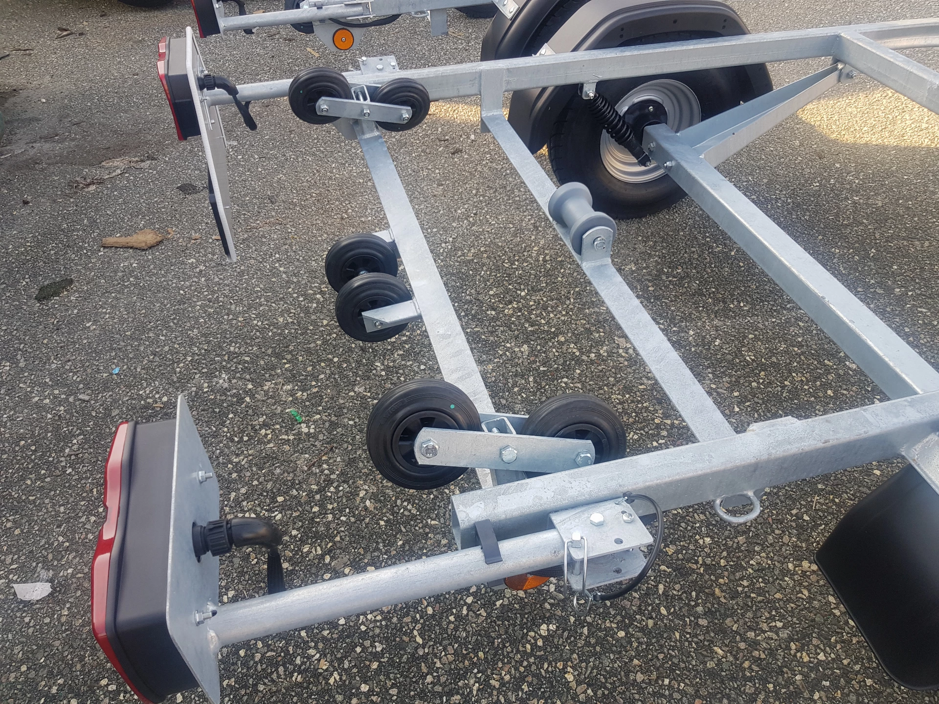 Spesialutviklet båthenger særlig egnet for Hasle Summer Fun og lignende småjoller! Håndlaget i Norge, for norske forhold. Progressive spiralfjæringer, dobbeltvirkende støtdempere og gummibuffere sikrer eksepsjonell kjørekomfort med minimal ytre påvirkning. Justerbar baugstøtte med vinsj. Baklyktene kan enkelt vippes til siden ved sjøsetting. Superruller og 10’’ hjuldimensjon gir lav innlastingshøyde, for enkel sjøsetting og opptak av småbåter.