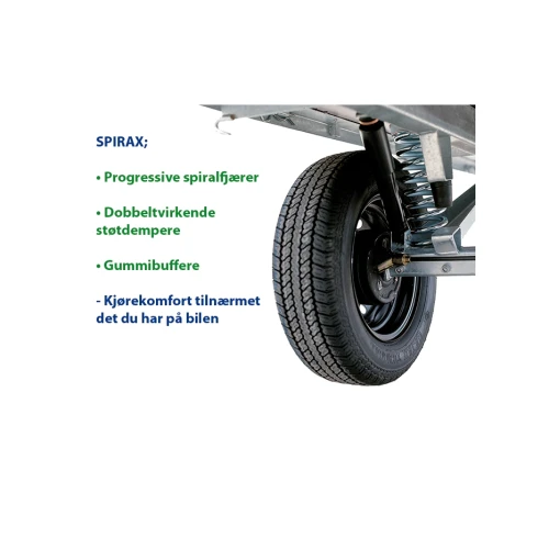Utstyrt med SPIRAX! Spesialkonstruert fjæringssystem; Tilhengerne fra Tredal har progressive spiralfjæringer, dobbeltvirkende støtdempere og gummibuffere på alle hjul. Dette gjør at Tredal tilhengere stiller i en klasse for seg når det gjelder kjørekomfort, kjøreegenskaper og holdbarhet. SPIRAX bygger på samme prinsipp som de fleste biler har i dag. Derfor har en TREDAL henger tilnærmet samme kjøreegenskaper som bilen din. Det gir behagelig og sikker transport også på dårlige veier.
