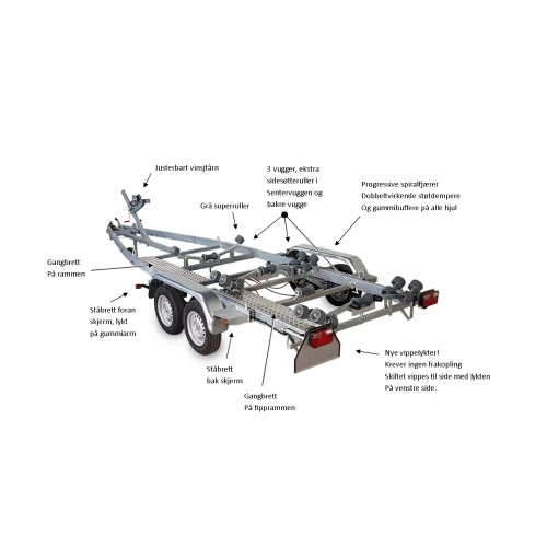 T-24-2600 er vår nest største Tredal båthenger. Kvalitetshenger konstruert for båter opp til 24 fot og nyttelast på hele 2050 kg. Hengeren har bedde på hele 230 cm. og er håndlaget i Norge, for norske forhold. Solid og stabil kvalitetshenger med lavt tyngdepunkt og vektfordeling på 4 stk. lavprofildekk (165 R 13 C 8) for optimal balanse. Tredal har markedets råeste tippløsning med tipping av hele firkantrammen bak; både sentervuggen og bakre vugge vippes bakover og skråstilles med firkantrammen. Baklyktene løses enkelt ut og vippes til siden, uten demontering, uten bruk av verktøy og uten løse deler. Sjøsetting, opptak og transport utføres effektivt og trygt i en håndvending. Progressive spiralfjæringer, dobbeltvirkende støtdempere og gummibuffere på alle fire hjul motvirker slag og støt. Systemet sikrer eksepsjonell kjørekomfort med minimal ytre påvirkning. Justerbar baugstøtte med vinsj. oppgraderte lykter, superruller og meget lav innlastingshøyde.