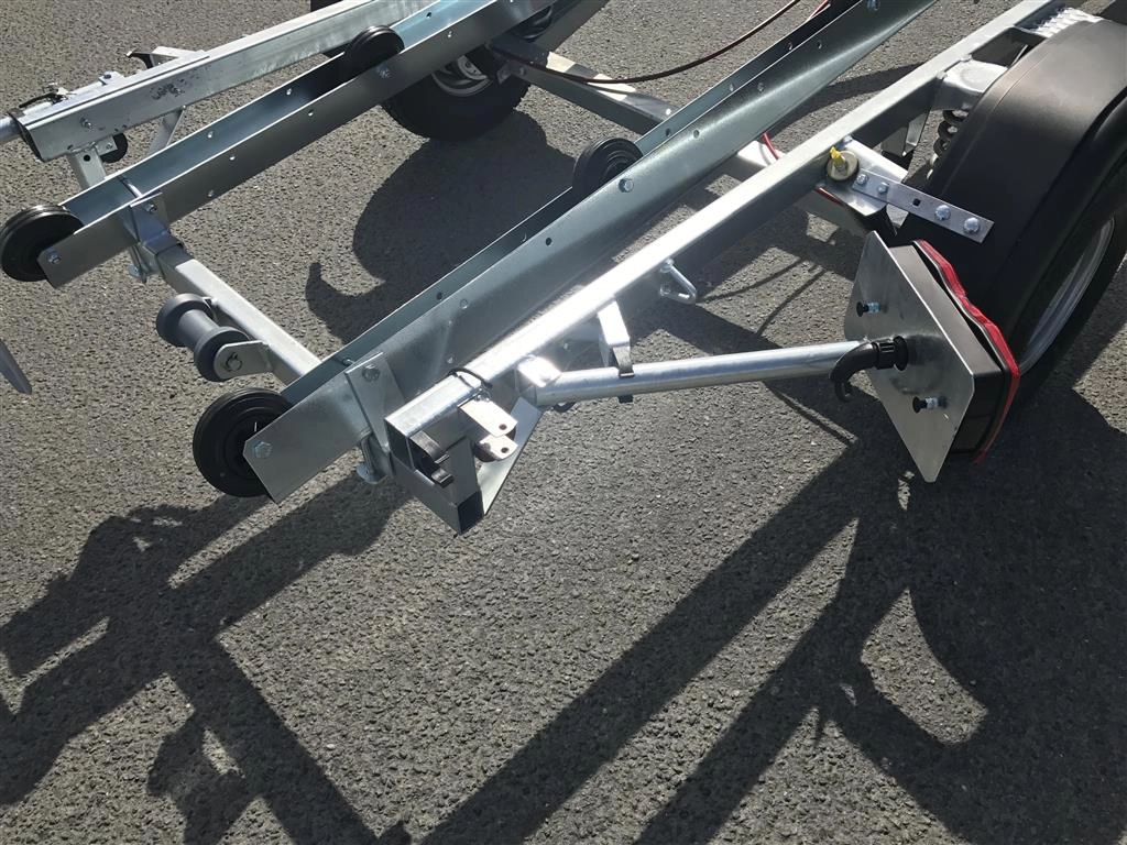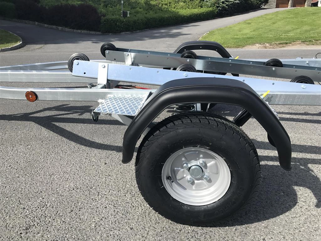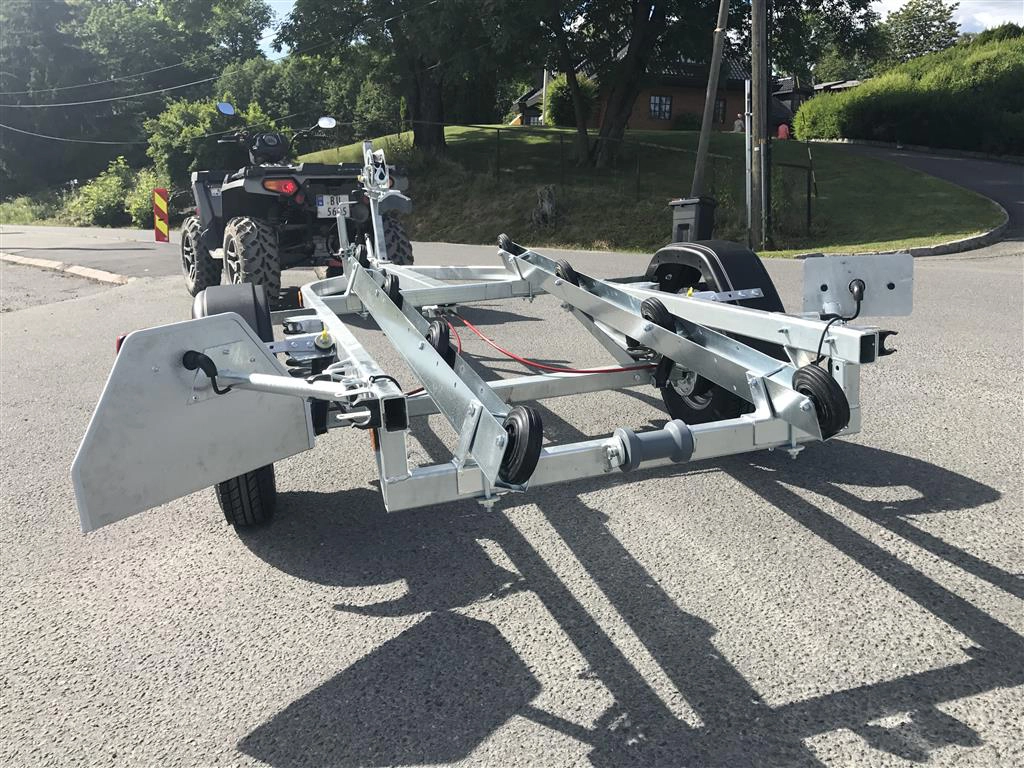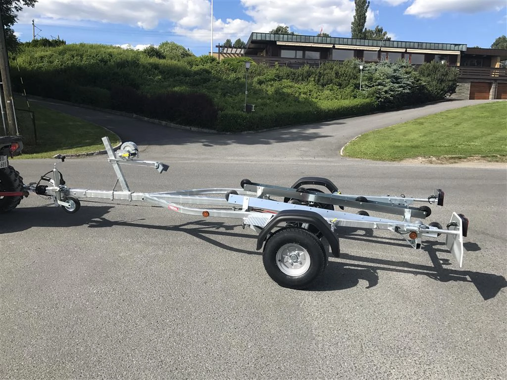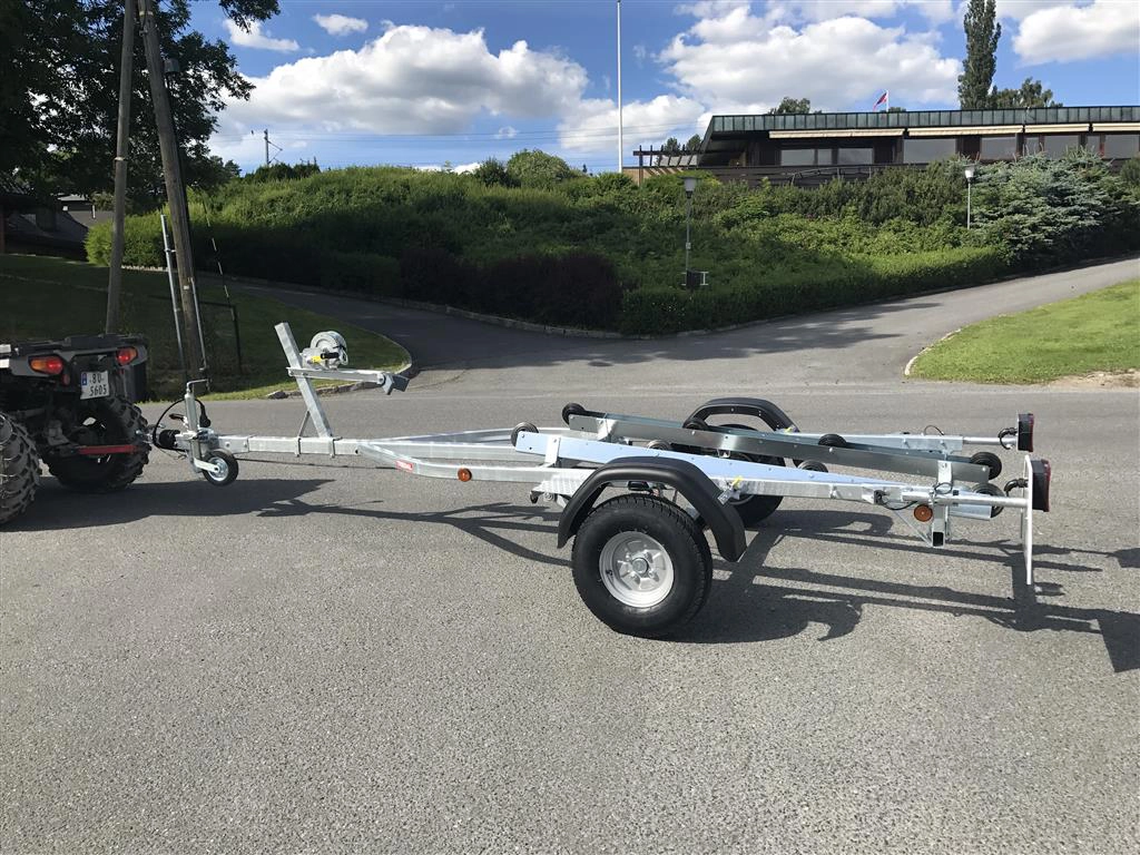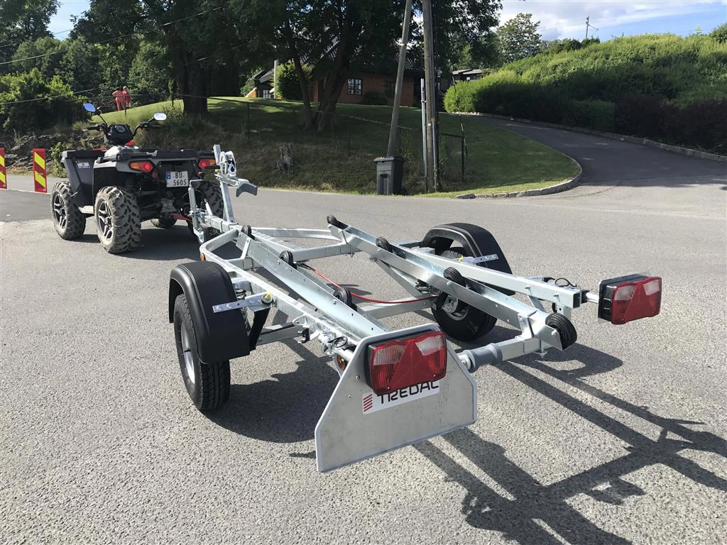 Tredal vannscooterhenger med brems. Hengeren har skinner med ruller for enkel sjøsettting og opphaling av vannscooter på en meget skånsom måte. Tredals SPIRAX system med progressiv spiralfjæring, dobbeltvirkende støtdempere og gummibuffere sikrer samtidig eksepsjonell kjørekomfort med minimal ytre påvirkning. Brems gir lovlig 80 km/t selv med aktuell vekt over 300 kg.