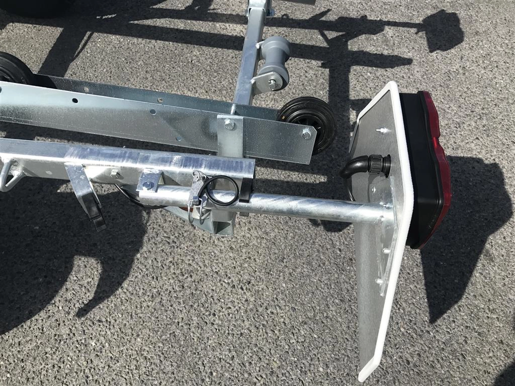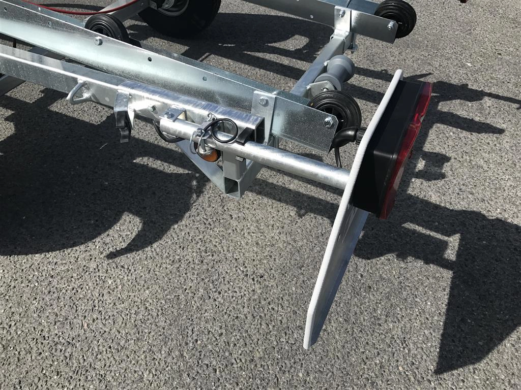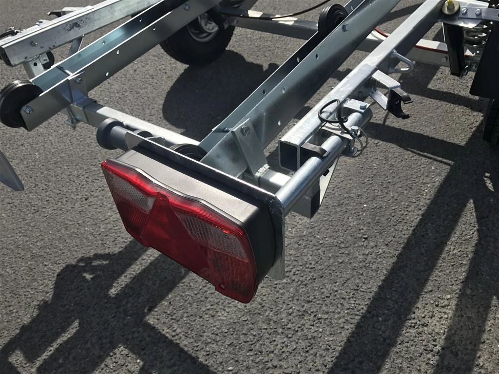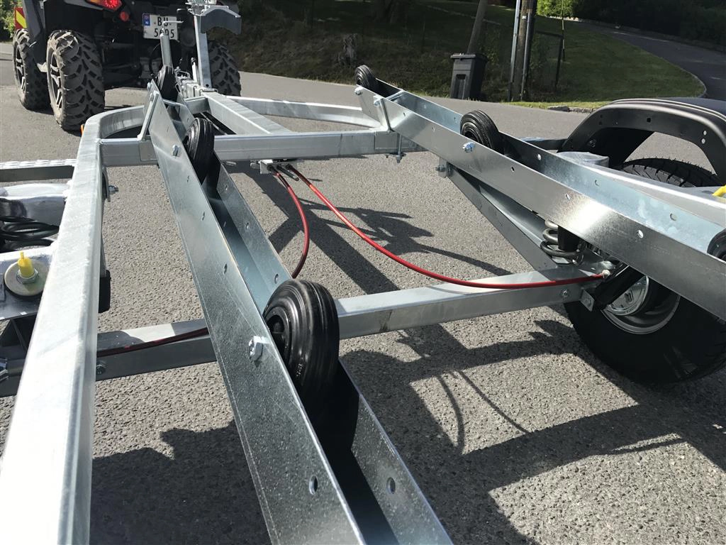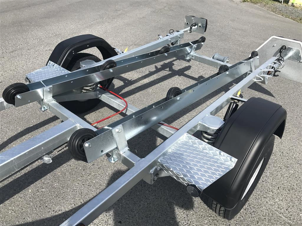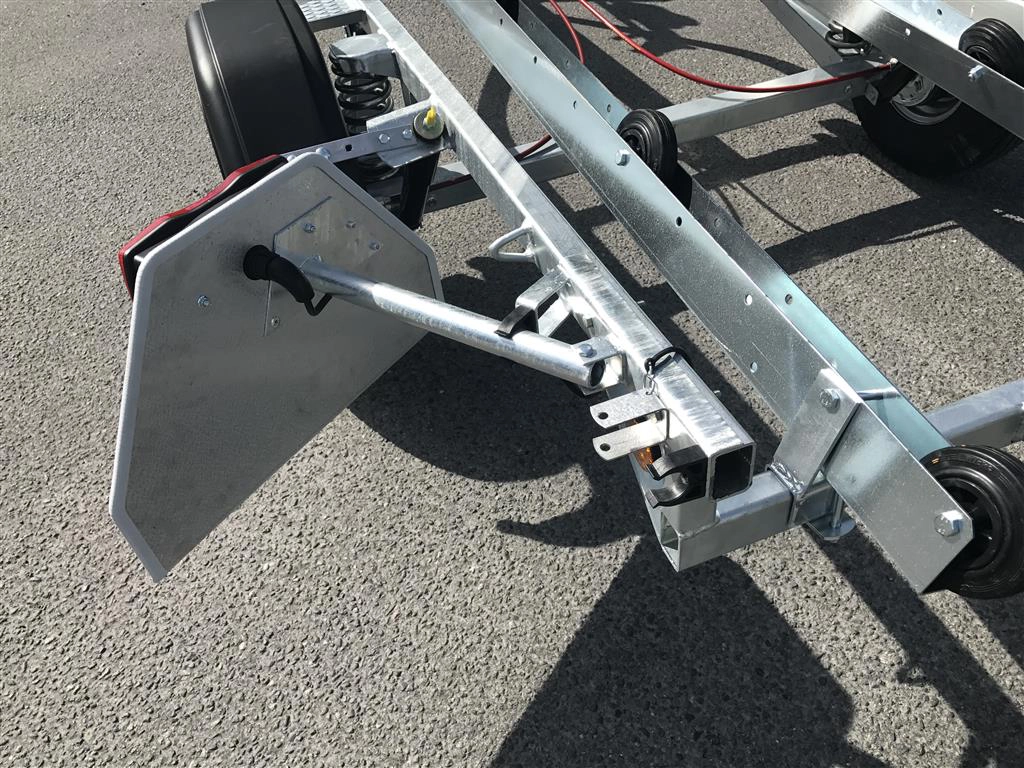 Tredal vannscooterhenger med brems. Hengeren har skinner med ruller for enkel sjøsettting og opphaling av vannscooter på en meget skånsom måte. Tredals SPIRAX system med progressiv spiralfjæring, dobbeltvirkende støtdempere og gummibuffere sikrer samtidig eksepsjonell kjørekomfort med minimal ytre påvirkning. Brems gir lovlig 80 km/t selv med aktuell vekt over 300 kg.